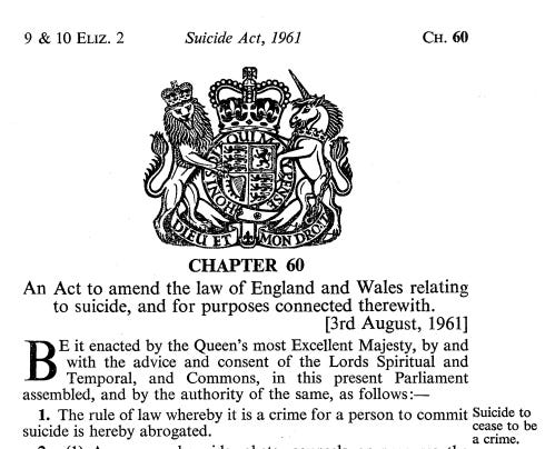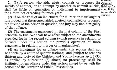 “Section 2(1) of the Suicide Act 1961 provides: “A person who aids, abets, counsels or procures the suicide of another, or an attempt by another to commit suicide, shall be liable on conviction on indictment to imprisonment for a term not exceeding fourteen years.”