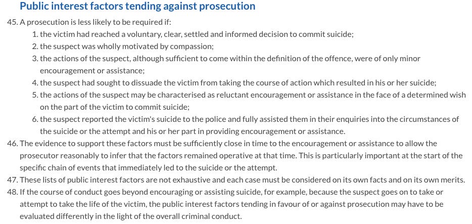 In respect of assisted suicide, the published position is that there will be factors against there being a public interest in prosecutions: