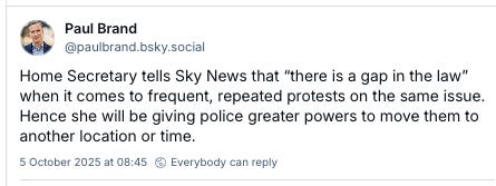 In this particular context, a right to protest should only be allowed once or twice. It does not matter if the thing being protested continued, that is it: your time is up, you’ve had your fun and now you’re going to be arrested and prosecuted.