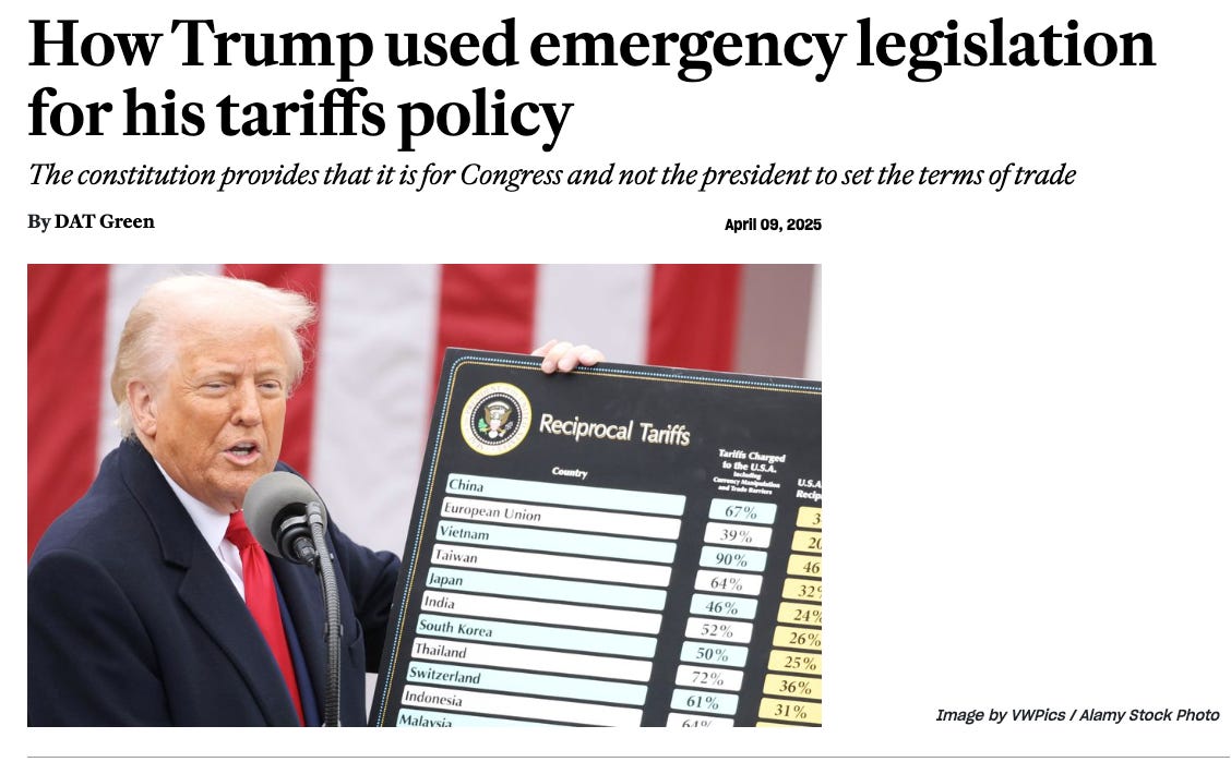 Regardless of the constitution expressly stating regulating trade is a matter for Congress, Trump can simply declare an emergency and so take it upon himself to recast the tariff policy of the United States with almost every country in the world.