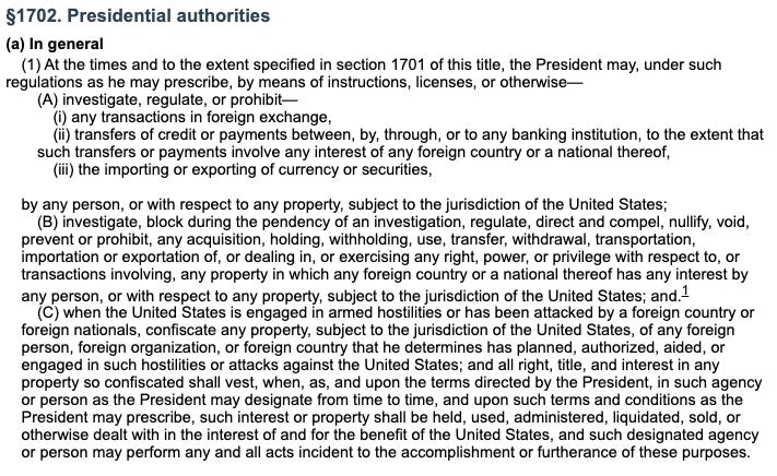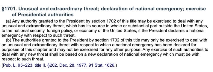 A statute from 1977 enables a president to take measures in the event of an emergency - that there is an “unusual and extraordinary threat”.