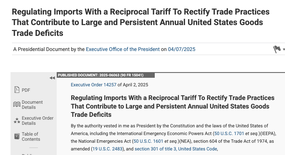 “I, DONALD J. TRUMP, President of the United States of America, find that underlying conditions, including a lack of reciprocity in our bilateral trade relationships, disparate tariff rates and non-tariff barriers, and U.S. trading partners' economic policies that suppress domestic wages and consumption, as indicated by large and persistent annual U.S. goods trade deficits, constitute an unusual and extraordinary threat to the national security and economy of the United States. That threat has its source in whole or substantial part outside the United States in the domestic economic policies of key trading partners and structural imbalances in the global trading system. I hereby declare a national emergency with respect to this threat.”