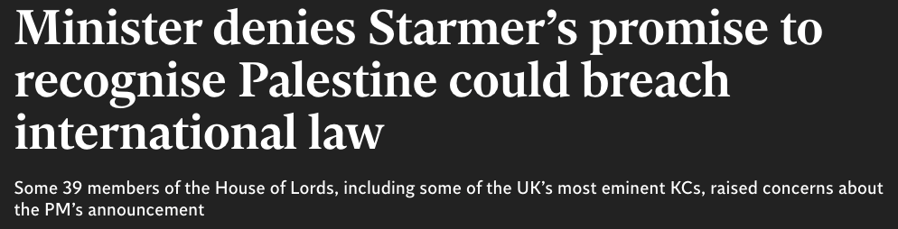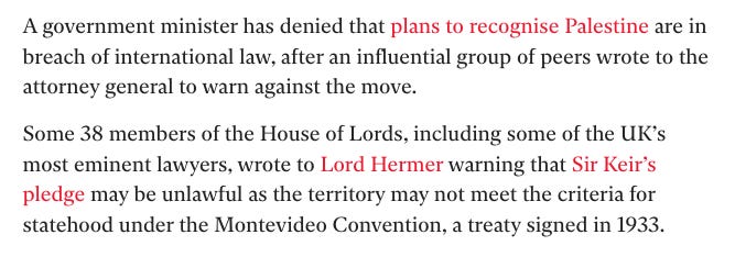 A couple of weeks ago a letter was put together in response to the possibility that the United Kingdom may recoginse Palestine. It was signed by some well-known lawyers, some of whom I know and admire.