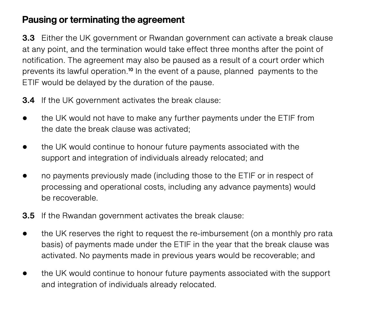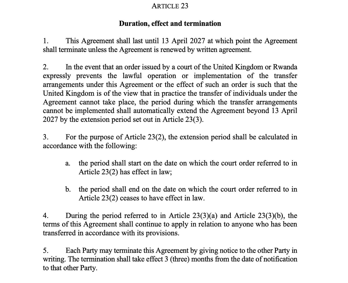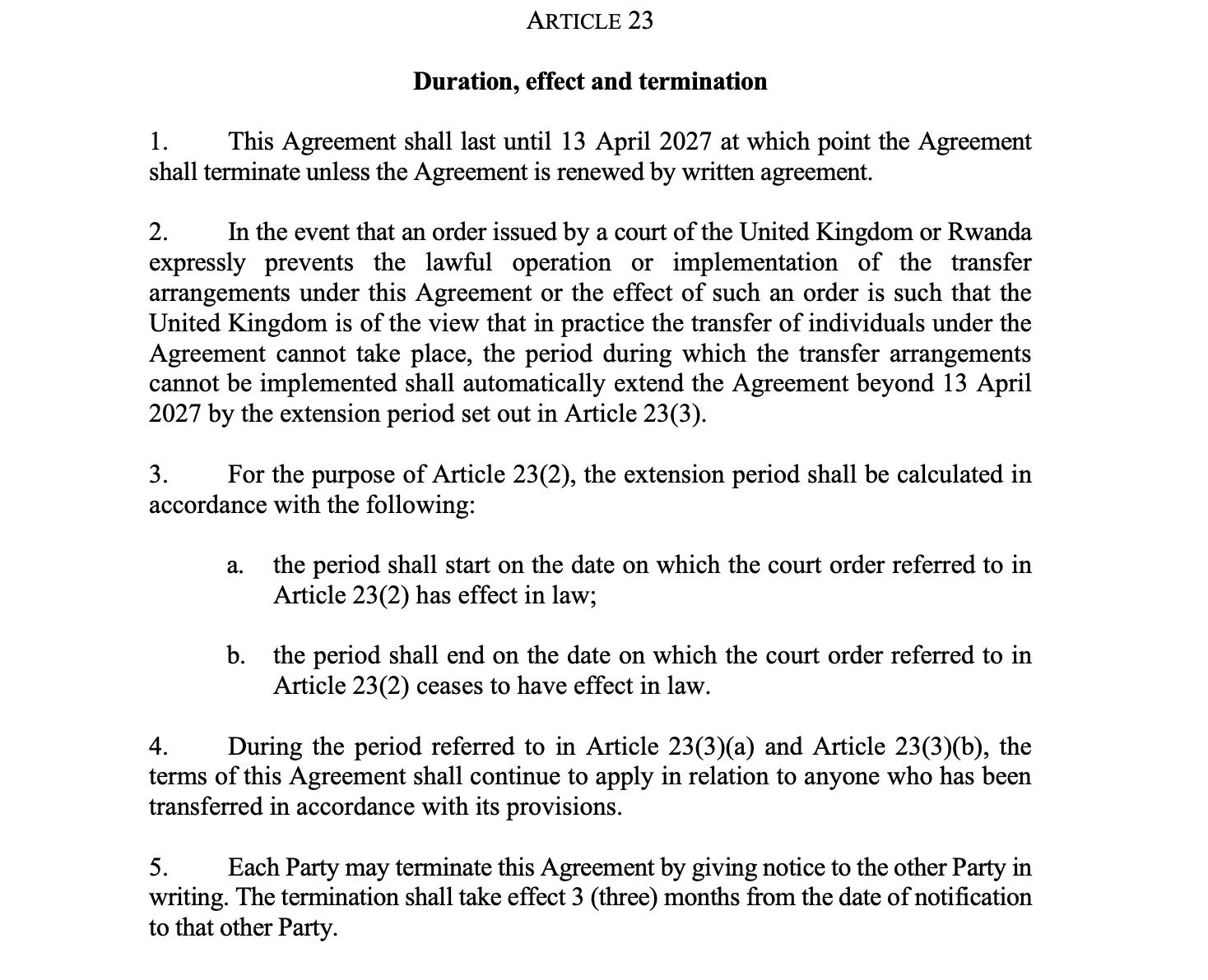 If an order issued by a court of the UK or Rwanda prevents the lawful operation or implementation of the transfer arrangements, the period during which the transfer arrangements cannot be implemented lawfully would not count towards the five-year duration of the agreement.