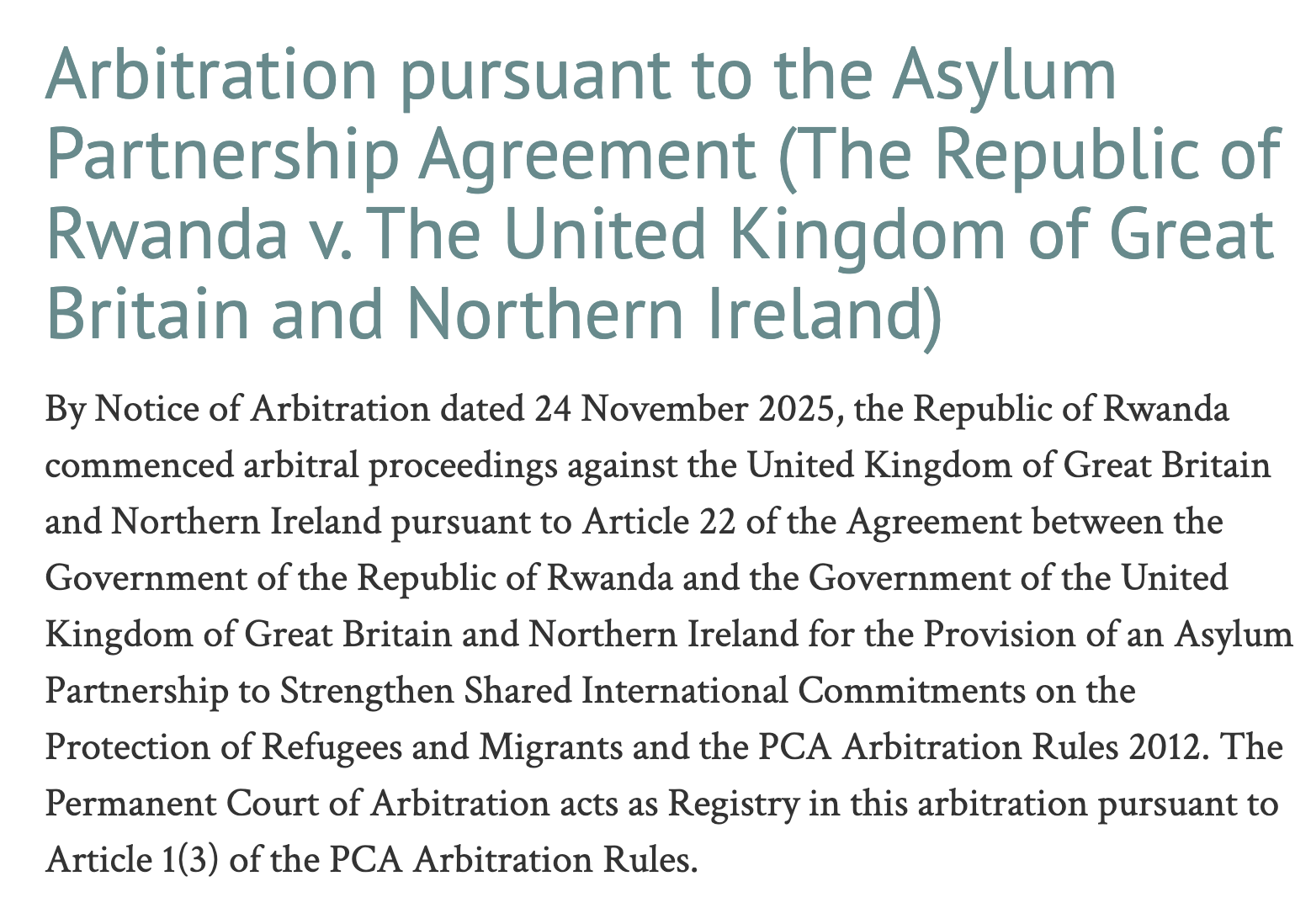 The Republic of Rwanda, on 24 November 2025, submitted a Notice of Arbitration to the Permanent Court of Arbitration under Article 22 of the Treaty between the United Kingdom and Rwanda concerning the Migration and Economic Development Partnership (“MEDP”).