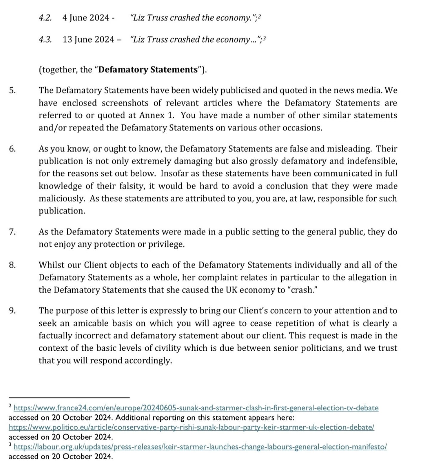 The letter is addressed to Starmer, but it describes a claim Truss could also make against world.