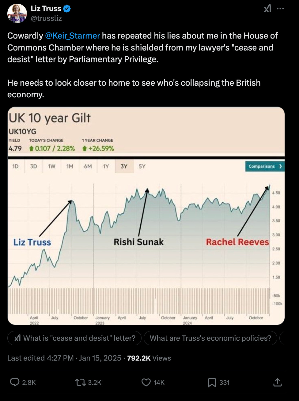 Here, if Truss sincerely thinks accusing someone of crashing the economy is defamatory (subject to any defences), then she is with her “closer to home” comments herself defaming someone else in turn.